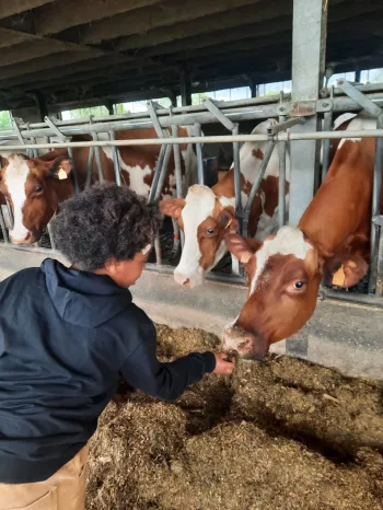 Tijdens het bezoek zien ze van dichtbij hoe een koe gemolken wordt, helpen mee met het voederen, aaien de kalfjes en begeleiden de koeien naar de weide.